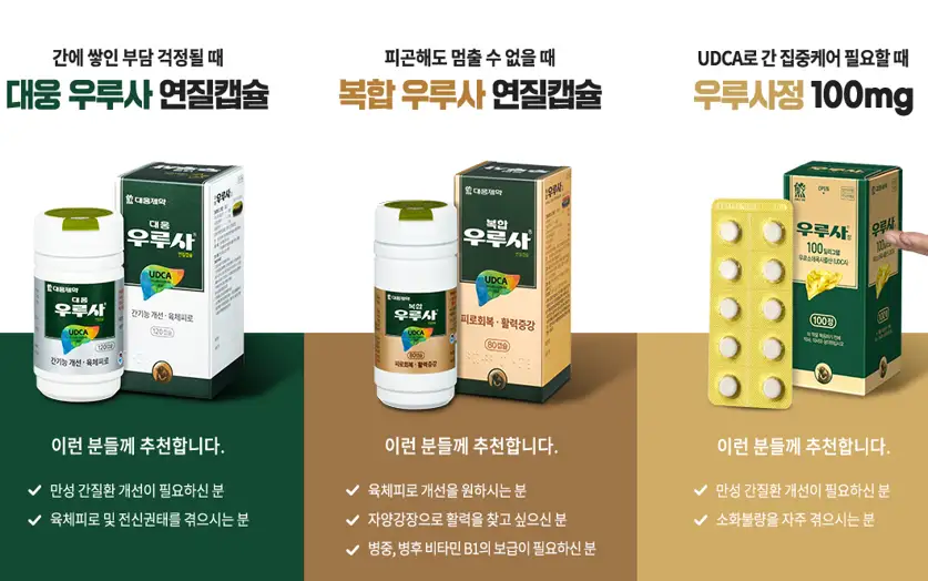 - UDCA 함량과 다른 성분들의 차이에 따라 '대웅 우루사 연질캡슐', '복합우루사 연질캡슐', '우루사정 100mg'으로 구분됩니다.